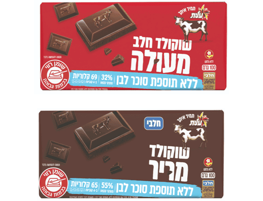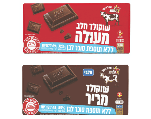 מדובר בשוקולד חלב ושוקולד מריר באריזה חדשה ללא תוספת סוכר לבן ועשיר בסיבים תזונתיים .
